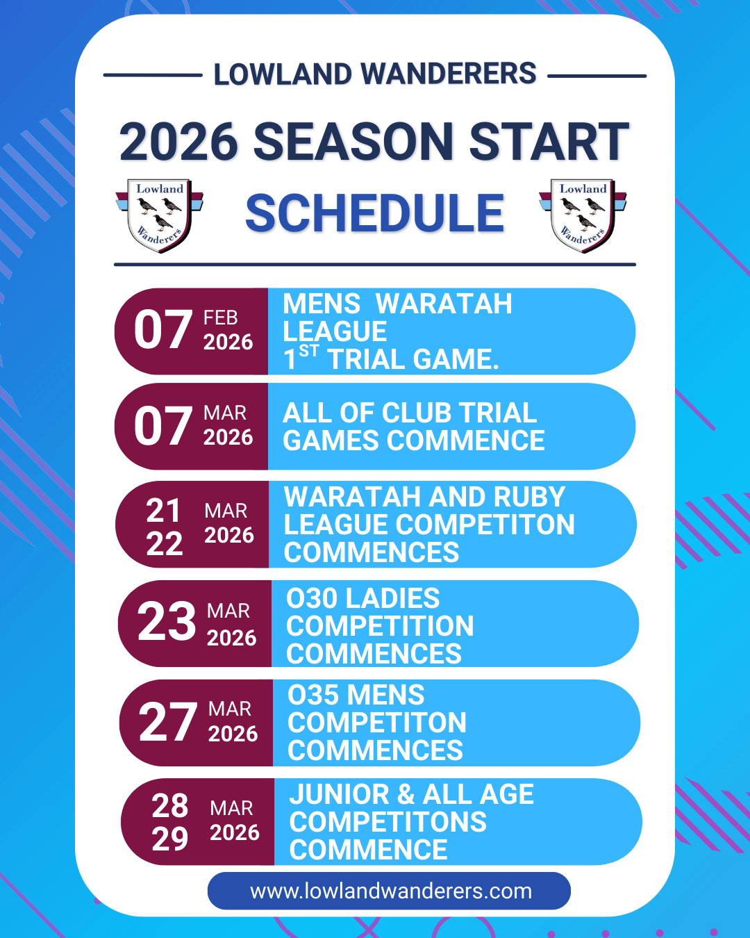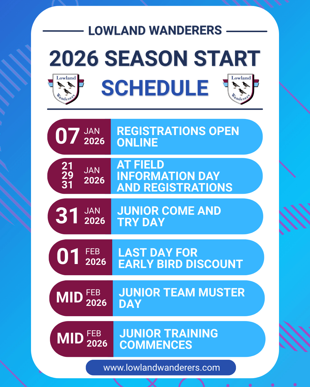 Players are required to obtain their own boots, shorts, socks and shin pads. Shorts and socks are available to purchase from the club. Playing shirts are provided by Lowland Wanderers Soccer club and are to be returned at the end of the season.